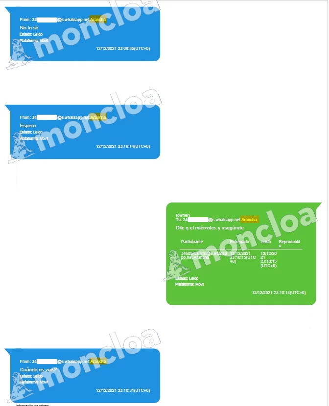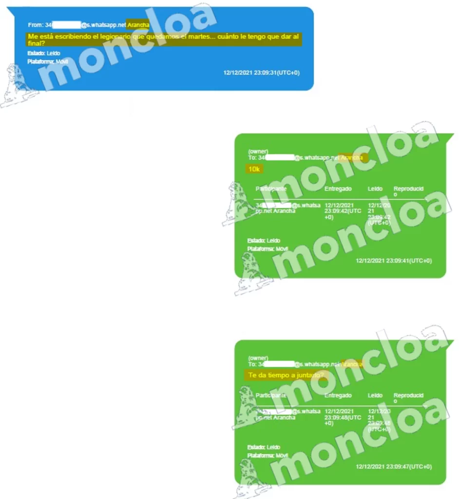 En esa conversación extraída por la UCO, ya que estaba guardada en el teléfono incautado tras su detención a Javier Javito Serrano, Arancha dice que «me está escribiendo el legionario (Joseba García) que quedamos el martes… cuánto te tengo que dar al final?» y Serrano responde «10K (10.000). Te da tiempo a juntarlo?», a lo que Arancha responde que «no sé, espero». Entonces Serrano le dice «dile que el miércoles y asegúrate».