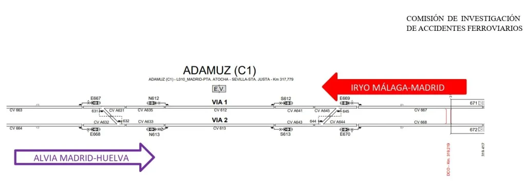– A las 19:43:20 el tren Iryo 6189 ocupa el circuito de vía 667 de la vía 1. Dicho circuito de vía abarca desde la salida del túnel Loma del Partidor Norte (PK 319+412) hasta el circuito de vía correspondiente a la aguja del desvío Sur de Adamuz (PK 318+656). Este circuito de vía es, por lo tanto, el circuito en el que se localizó la fractura del carril, a la altura del PK 318+681.