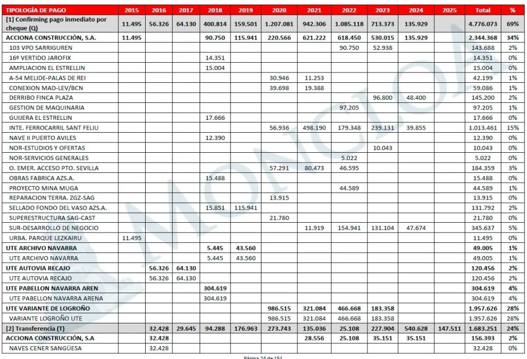 También explican que «se ha llevado a cabo un análisis específico de los pagos efectuados a Servinabar 2000, S.L., a partir de la extracción y consolidación de información proveniente de las bases de datos de facturación empleadas por Acciona Construcción y de la documentación de soporte adicional. El objetivo ha sido identificar la totalidad de pagos realizados a origen a dicho proveedor, con el fin de identificar los medios de pago utilizados y comprobar su congruencia con los procedimientos de pago de Acciona Construcción».