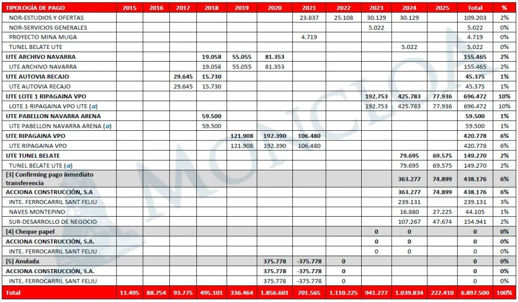 Acciona mantiene que «todas las facturas han sido pagadas, con excepción de cuatro, que permanecen bloqueadas por un importe conjunto de 54.503 €, por lo que, la cantidad total abonada asciende a 6.842.998 €. Todo ello elimina el riesgo relativo a que pudiera haberse realizado algún pago en efectivo metálico o mediante cheque al portador».