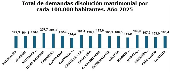 Poniendo en relación las demandas de disolución matrimonial del total del año con la población a 1 de enero de 2025, el número de demandas de disolución por cada 100.000 habitantes en España fue de 171,9.