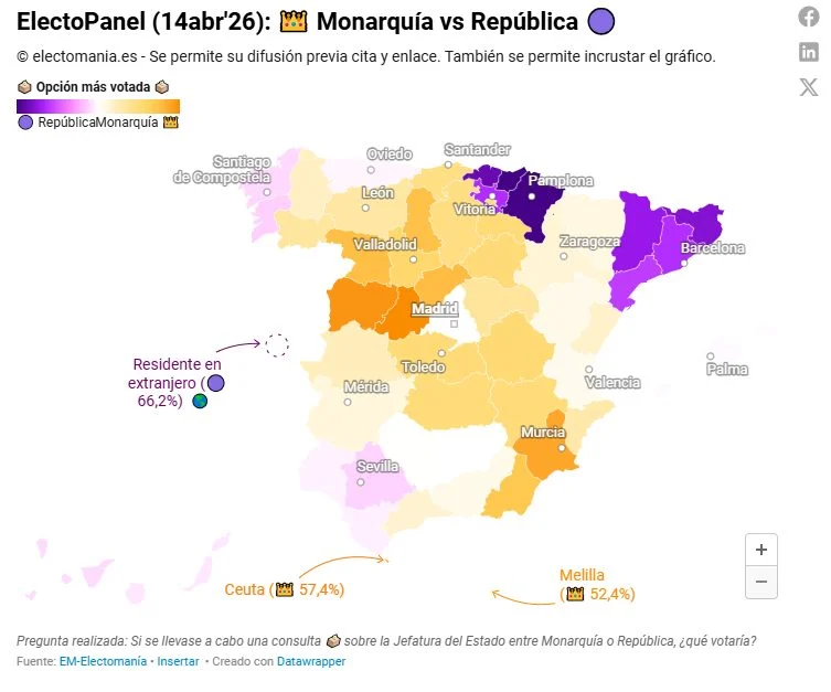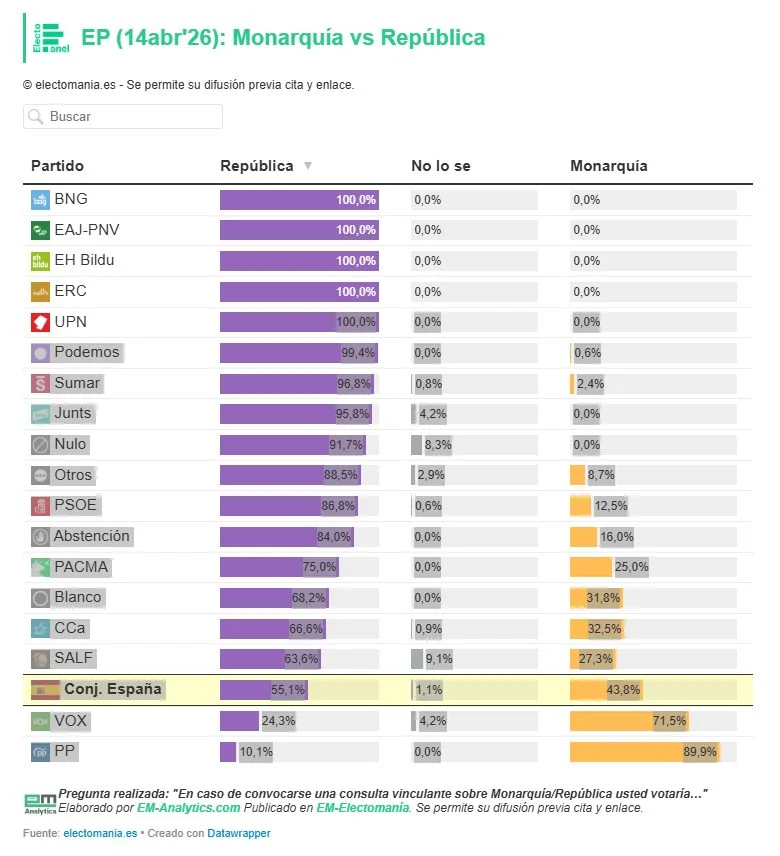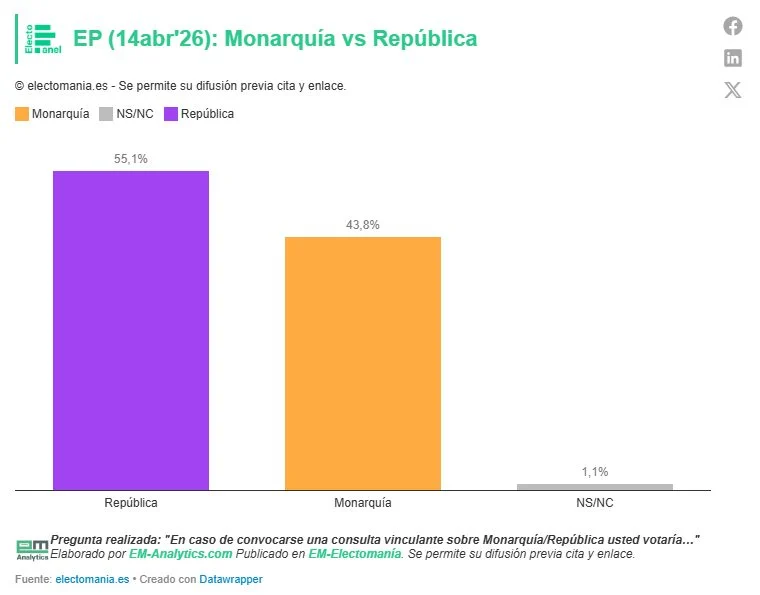 La fecha del 14 de abril siempre ha tenido una carga simbólica innegable en España, pero en 2026 los datos parecen dar un paso más allá de la efeméride. La última encuesta publicada por Electomanía arroja un resultado que ha encendido todas las alarmas en los sectores monárquicos y ha insuflado optimismo en los movimientos republicanos: en una votación directa sobre el modelo de Estado, la opción de la República lograría la victoria. Este vuelco demoscópico no es un fenómeno aislado, sino la culminación de un proceso de erosión de la imagen institucional frente a una ciudadanía que demanda mayor capacidad de decisión.