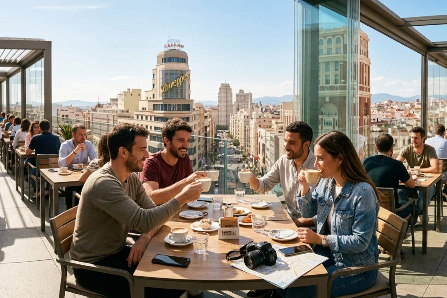 Si quieres algo tranquilo, entonces la terraza de El Corte Inglés de Callao es perfecta y práctica. ¿Te faltan algunas compras? No importa, este lugar es perfecto para una vista icónica y gratuita del edificio Carrión y de la Gran Vía hacia Plaza España, donde podrás ver también el famoso cartel de Schweppes. Esta terraza se ha convertido en el espacio gastronómico favorito de muchos madrileños.