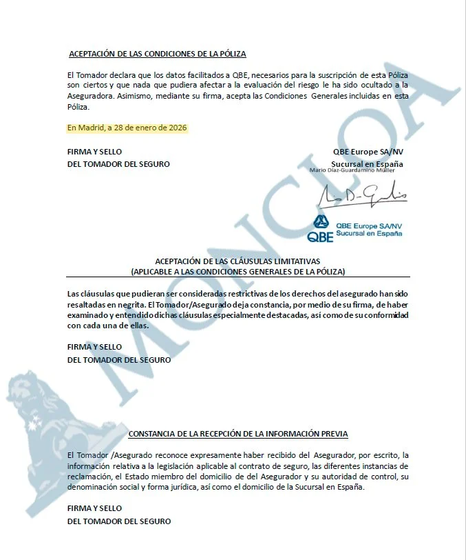 La empresa también pone a disposición del juzgado la póliza que cita. En la misma se cita como objeto: «La finalidad del seguro es garantizar a los asegurados el pago de las indemnizaciones de las que puedan resultar civil o patrimonialmente responsables conforme a derecho, por daños