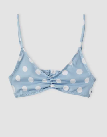 Los lunares (algunos los llaman topos) están de moda y han llegado hasta los bikinis. En Pull&Bear tenemos este modelo que lleva un frunce en la parte delantera, cierre en la espalda y tirantes regulables. Tiene el escote en forma de pico y no lleva aros, ni varillas, ni relleno, por lo que la comodidad es total. Está disponible en dos colores, azul celeste con lunares blancos y rosa chicle con lunares negros. Está fabricado con un 50% de poliéster reciclado a partir de botellas de plástico. Puedes usarlo con una parte de abajo diferente o comprarte la braga a juego. El precio es 7,99 euros.